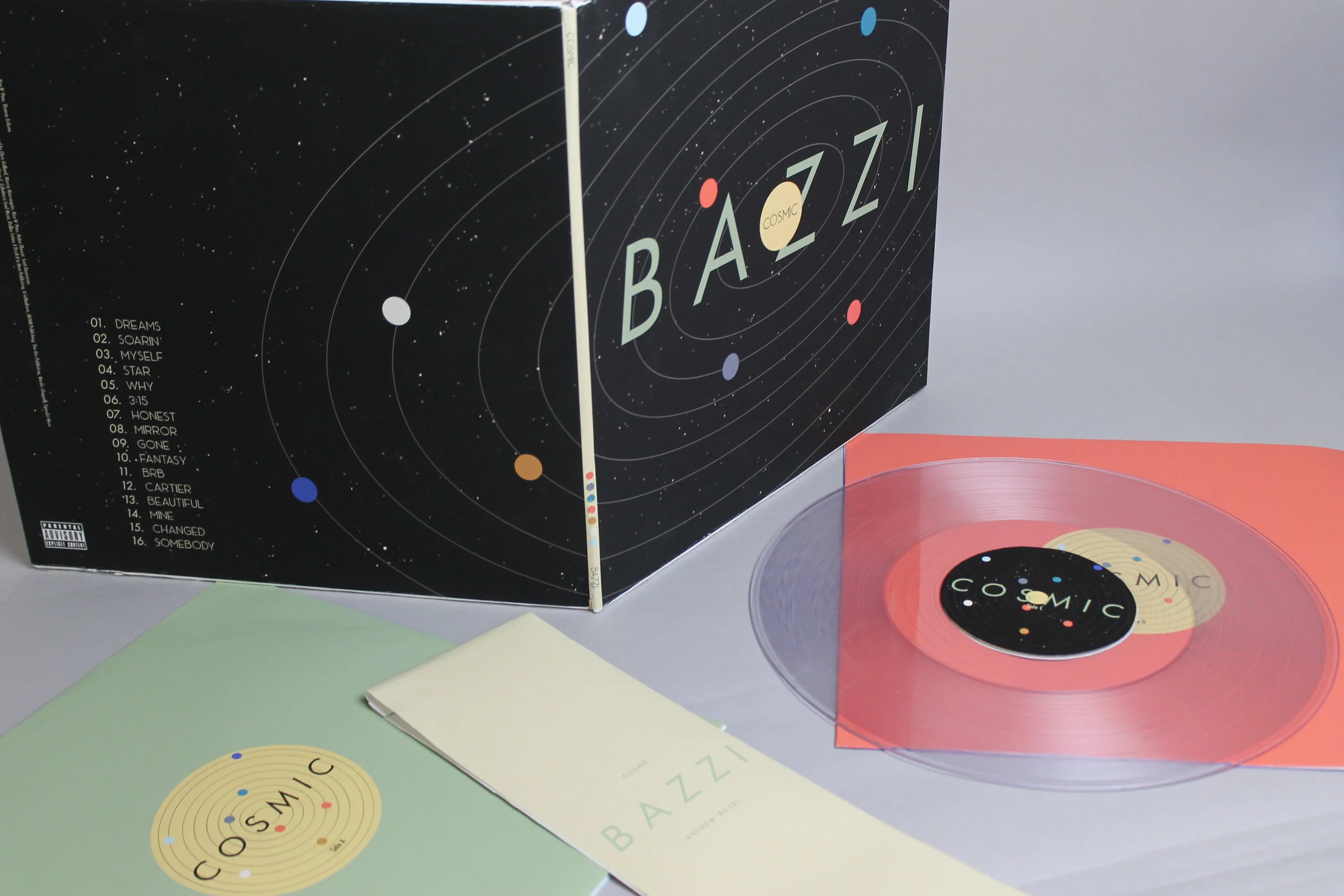 This project was completed for my Design III class as our final project. We had to make vinyl covers from scratch as well as an animation to side with it. I made mine based off of the album called Cosmic by Bazzi. It was a double album with two sleeves and a slip cover.